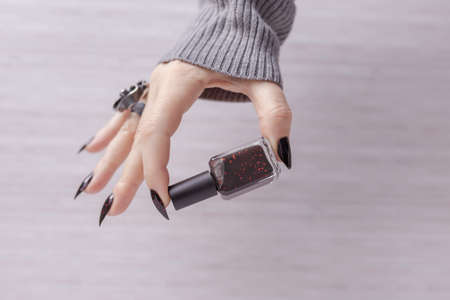 Woman's hands with long nails and gray black manicure with bottles of nail polish