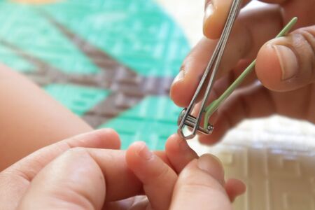Close up mother cutting baby's nails.