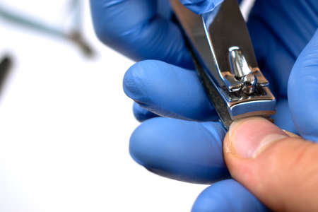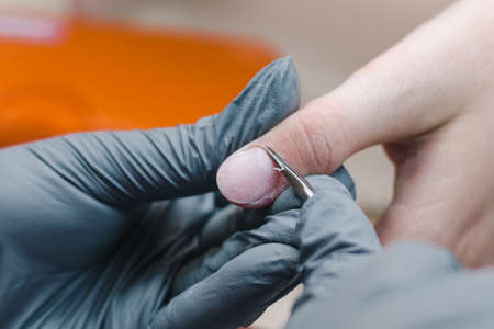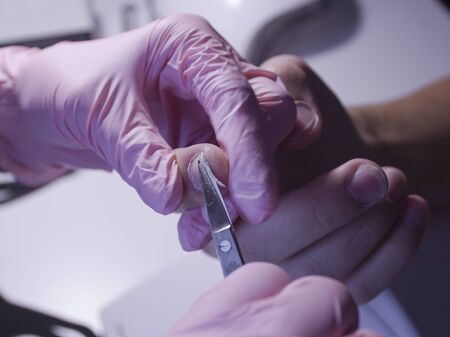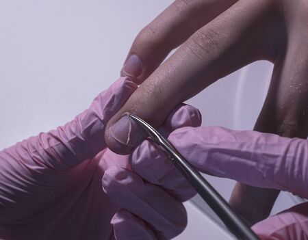 The pedicure master cleans the dirt from under the nails of the patient. Procedure at the podiatrist in the salon.