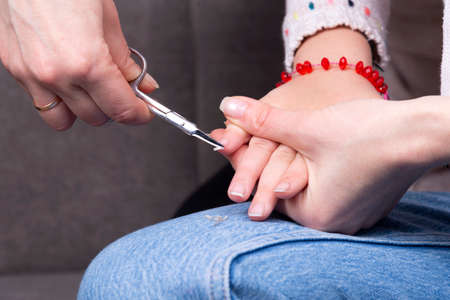 Woman cutting her fingernails with clipper.