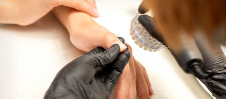 Close-up of hardware milling cutter for removing gel polish. Apparatus manicure in beauty salon. Manicurist with electric nail drill remove old gel from client nails. Process of replacing old shellac.