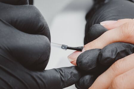 Closeup photo of professional manicurist painting nails of female client