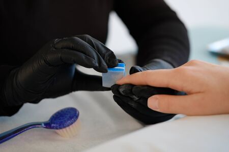Close-up of a manicurist in black rubber gloves polishes a clients nails with a nail buff. Perfect nails manicure process. Beauty and nail care concept