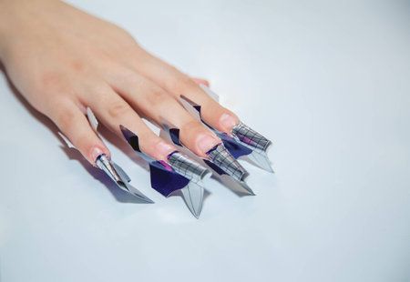 Female hand with blue nail design. Female hand with blue nail polish manicure hold nail clippers. copy space.