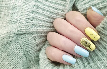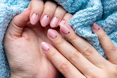 Female hands in a blue knitted sweater fabric with trendy beautiful manicure - pink nude nails with black small dots closeup. Selective focus