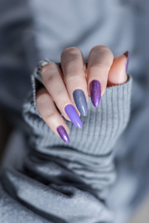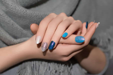 Female hands with glitter nail design. Blue nail polish manicure. Woman hands on gray wool shawl.