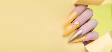 Female hand with yellow nail design. Long nail polish manicure. woman hand on yellow paper background