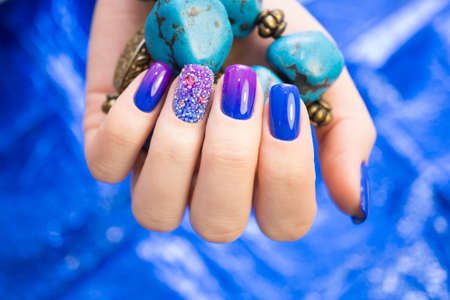 Beautiful female manicure on a blue background. Blue manicure on well-groomed hands.