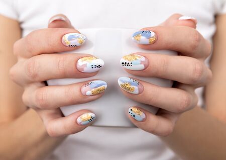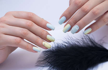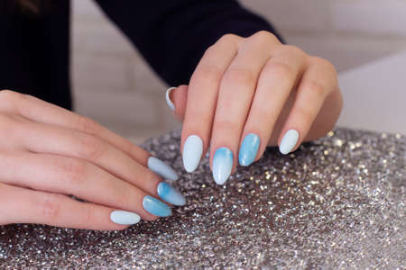 Beautiful female hands with romantic manicure nails, blue and white gel polish