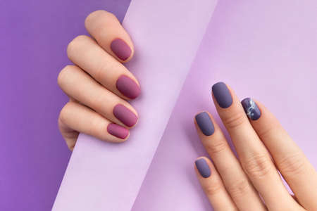 Beautiful purple burgundy matte manicure on creative background. Fashionable spring summer nail design.