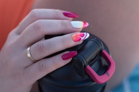 Female hand with bright red and blue manicure holds a bottle of nail polish