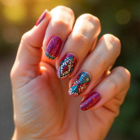 Bright red gel Polish with camouflage design and brushstrokes. A woman's hand with long almond-shaped nails and a multi-colored design.