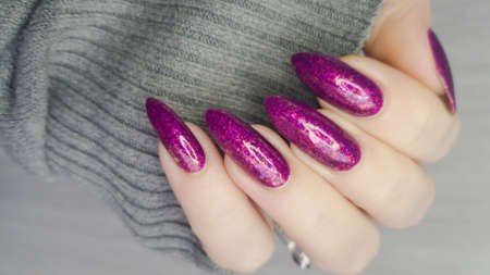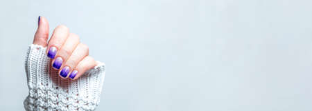 Banner female manicure purple gradient with glitter on nails. Concept cosmos, night on neutral background. copyspace.