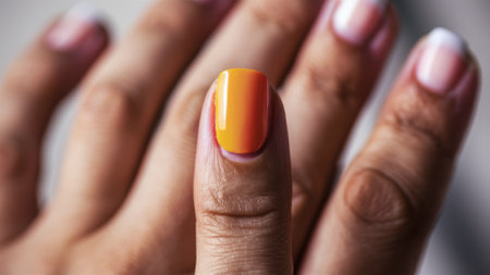 Beautiful womans hand with minimal nail design on orange background. Manicure, pedicure beauty salon concept