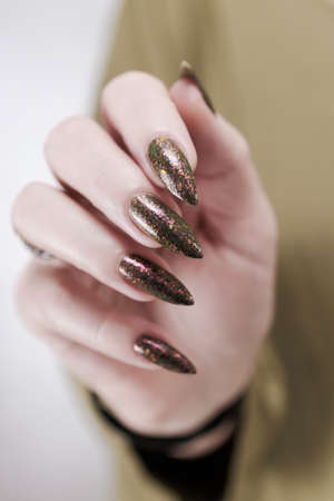 Female hand with trendy manicure. Nail design on a gold background closeup