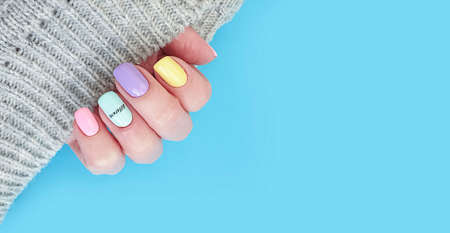 Hands with short manicured nails. Manicure covered with nail polish in summer colors. Girls manicured hands and copy space.