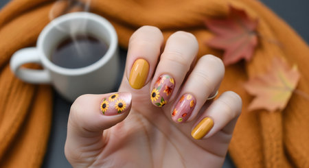 Woman's hands with trendy pastel color nails holding cup. Spring summer nail design. Manicure, pedicure beauty salon concept.