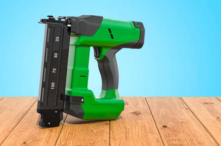 Electric Brad Nailer on the wooden planks, 3D rendering