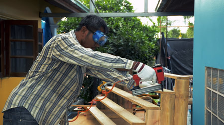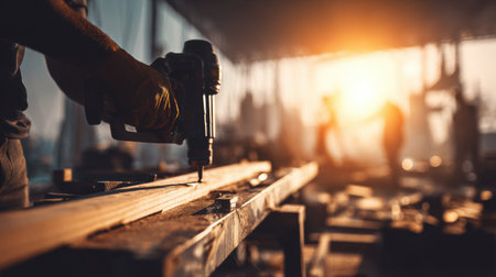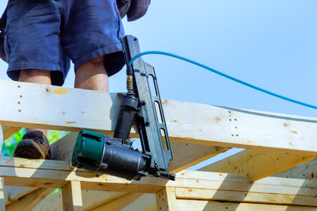 Skilled laborer operates air nail gun to secure wooden beams in construction site during works day