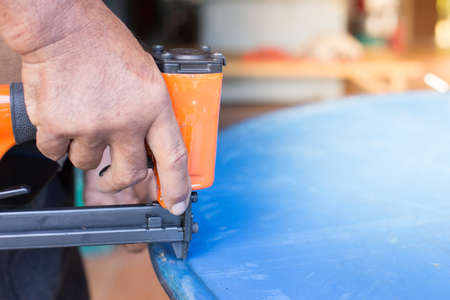 manufacture of upholstered furniture, upholstery of a furniture element with a pneumatic stapler, close-up