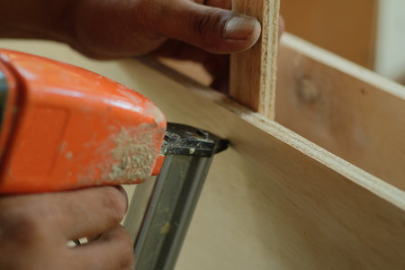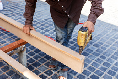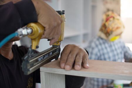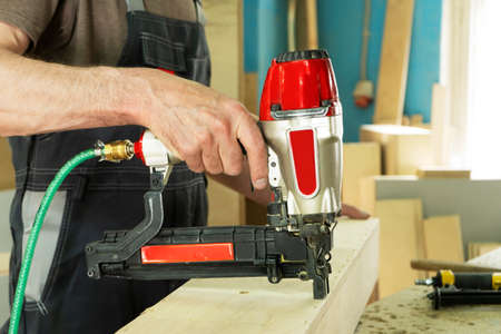 Carpenter using air nail gun doing wooden furniture work