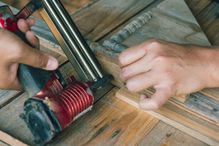 hand of a worker is using a nail gun on a piece of work carefully