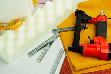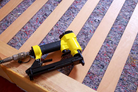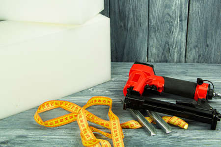 concept of furniture production and repair. Stapler and staples, working tool.