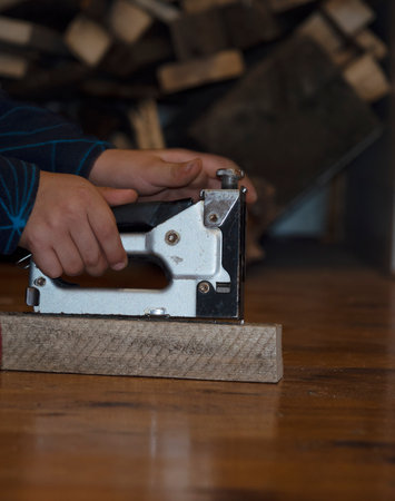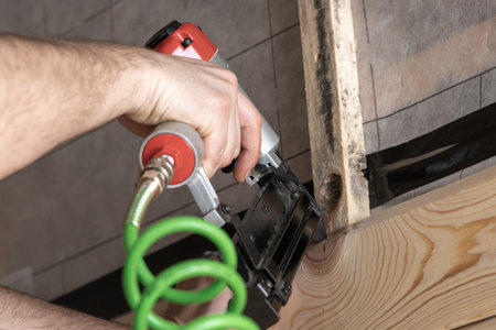 Cropped male builder hands use pneumatic stapler gun for clipping wooden timber board. Scoring metal nails and staples, making layout on wooden plank. Builder and civil engineer occupation. Side view