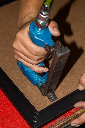 Close up of hand stapling the photo frame