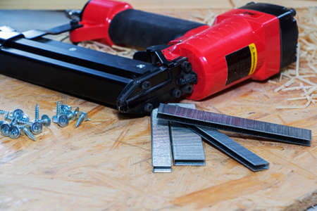 Carpentry stapler / Construction machinery held stapler on wooden background