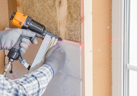 Carpenter worker at door installation with using air nail gun