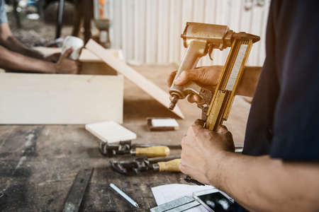 carpenter using nail gun or brad nailer tool on wood box in a workshop ,furniture restoration woodworking concept. selective focus