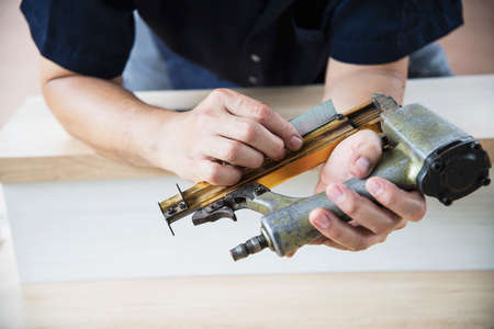 carpenter use air-gun for make new furniture