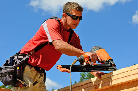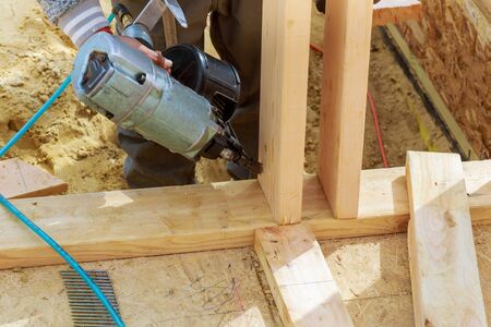 Contractor worker applies nail gun to wooden beams while working on construction project