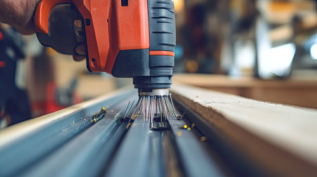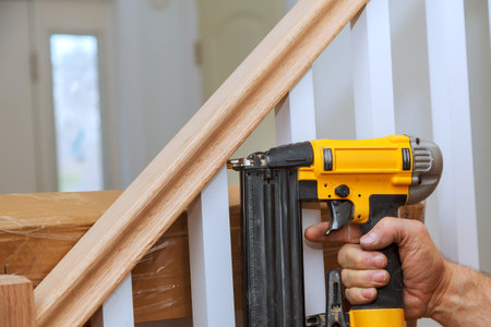 Carpenter uses nail gun to attach wooden railing inside house, tools materials are visible