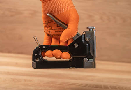 Construction stapler in male hand in building orange glove. Tool for repair.
