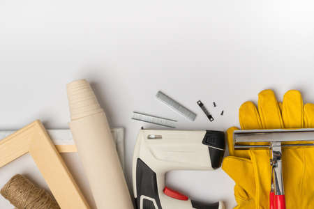 A tool for stretching natural canvas on a wooden stretcher. Gun stapler, forceps and wooden frame with canvas top view
