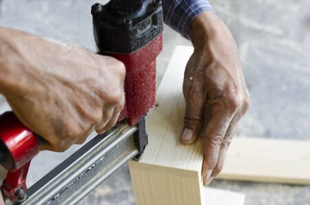 Hand holding nail gun to fix the wood