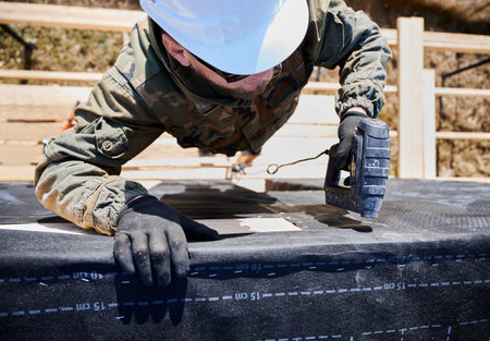 Male builder installing waterproof membrane on the wall of future cottage. Man worker building wooden frame house. Carpentry and construction concept.