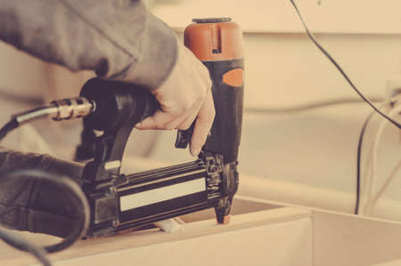 Man collects furniture details in the carpentry shop. Toned image. Uses a professional stapler or nail gun. close up view