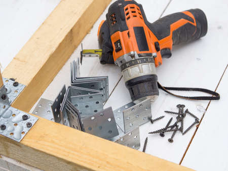 screwdriver, self-tapping screws and metal corners in the workplace, the concept of assembling a wooden house