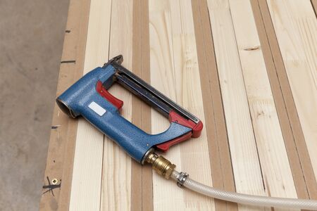 Pneumatic stapler lies on a wooden lamella