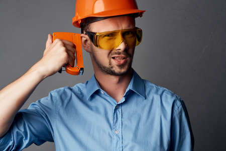Cheerful man in orange hard hat construction professional tools