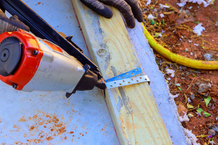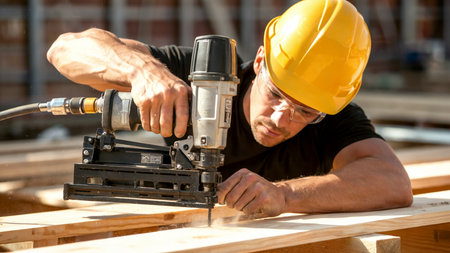 Skilled laborer operates air nail gun to secure wooden beams in construction site during works day