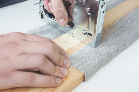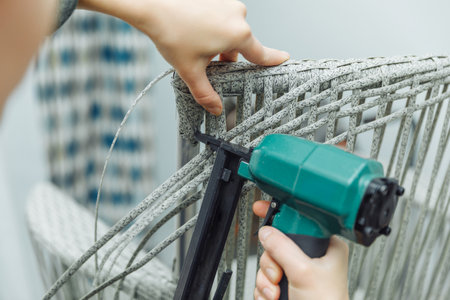 Worker repairing furniture with industrial/construction stapler top view