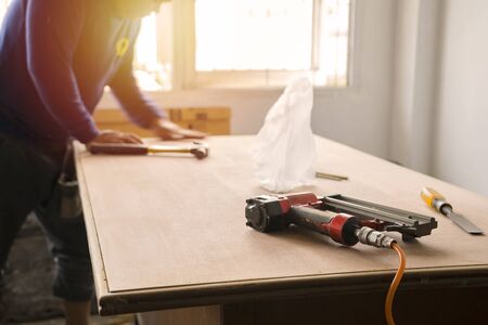 A worker installs plywood using a close-up stapler.Background for designers.