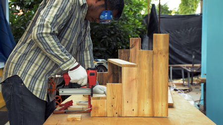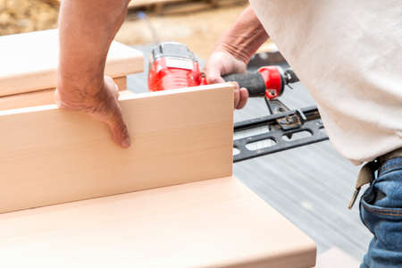 Carpenter using air nail gun doing wooden furniture work
