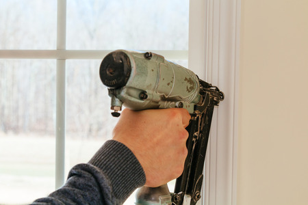 Carpenter brad using nail gun to moldings on windows, framing trim, close up on hand and nail gun