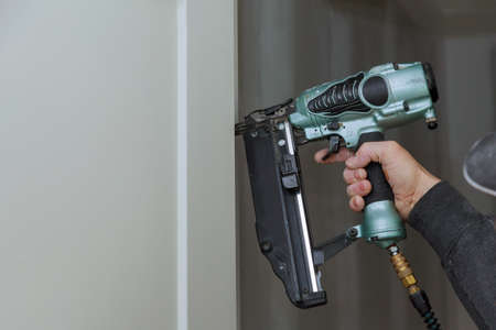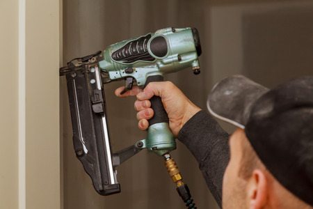 Carpenter using air nail gun installation of install in the new door