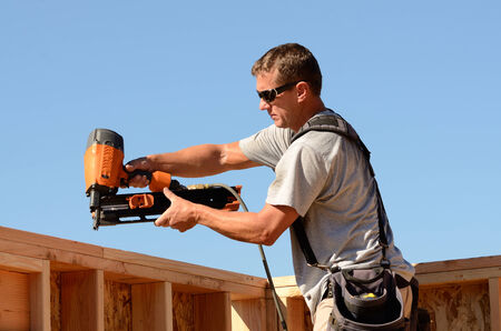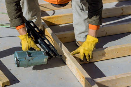Contractor worker applies nail gun to wooden beams while working on construction project